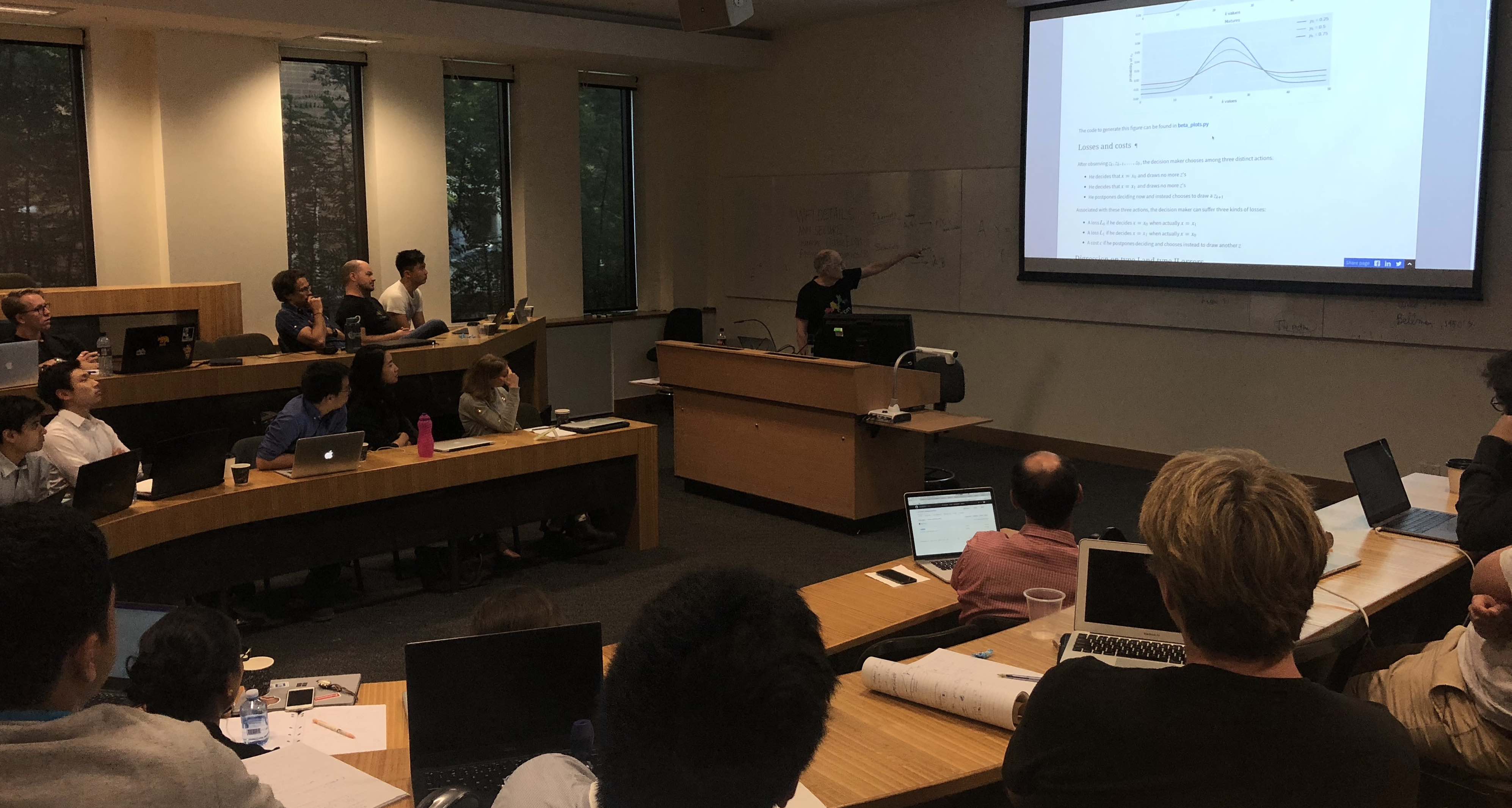 Over 30 Honours students from around Australia attended the QuantEcon Honours workshop at Australian National University on March 10th, 2018. The workshop covered modern methods in computational and dynamic modeling, and included a lecture from Tom Sargent during his visit to Australia. Students learned the basics of Python for scientific computing, as well as dynamic programming and economic applications to quantum computing.